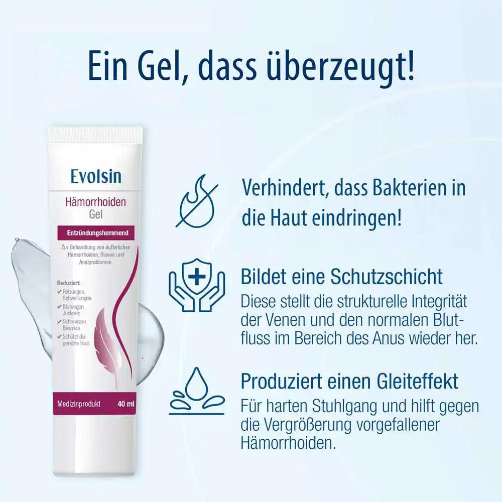 Das Evolsin® Hämorrhoiden Gel reduziert Brennen, Jucken, Schmerzen und Blutungen.