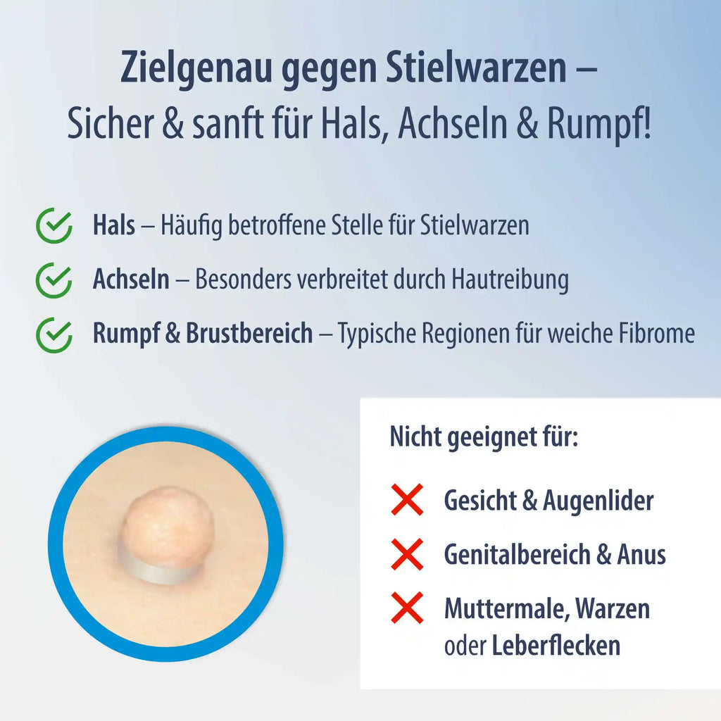 Es eignet sich zur Entfernung von Stielwarzen am Hals, unter den Achseln und in Hautfalten. Nicht anwenden im Gesicht (Augenlider), an Schleimhäuten, im Genital- oder Analbereich oder bei Muttermalen und Leberflecken.