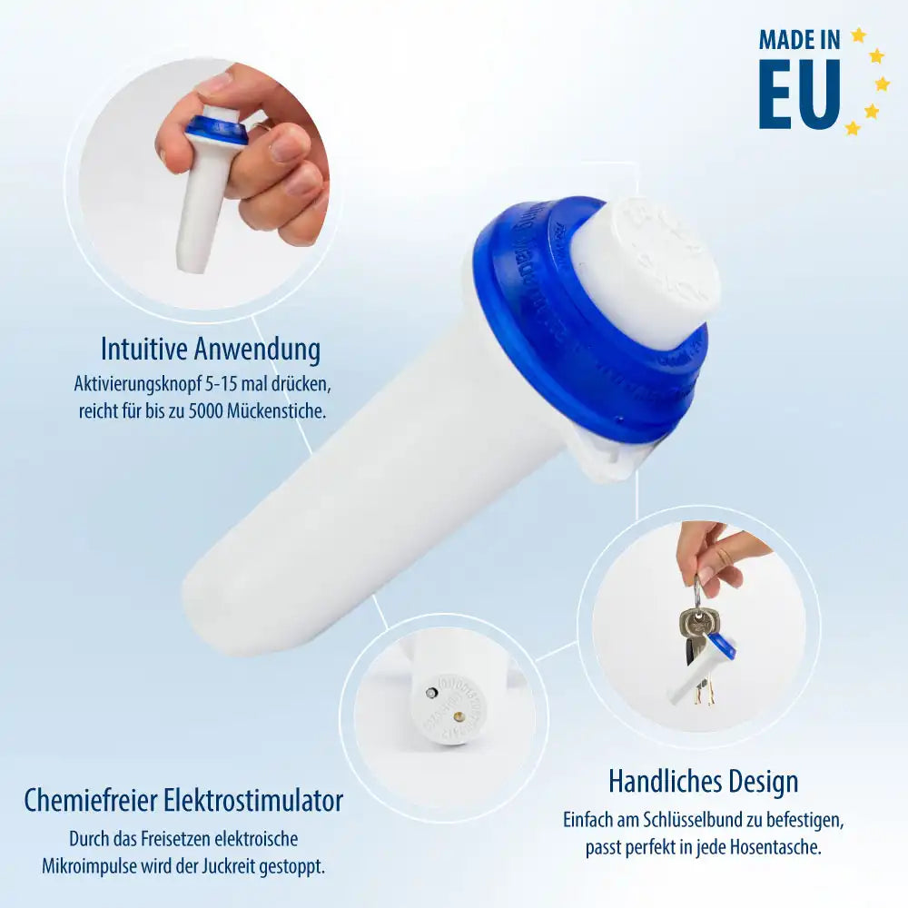 Der Anti-Stich arbeitet mit Piezoelektrizität: wenn der Aktivierungslink gedrückt wird, wird eine winzige Ladung erzeugt. Auf eine gestochene Stelle aufgetragen hilft es, Juckreizen zu reduzieren und verhindert, dass Sie sich kratzen, was eine Ursache für Infektionen sein kann.