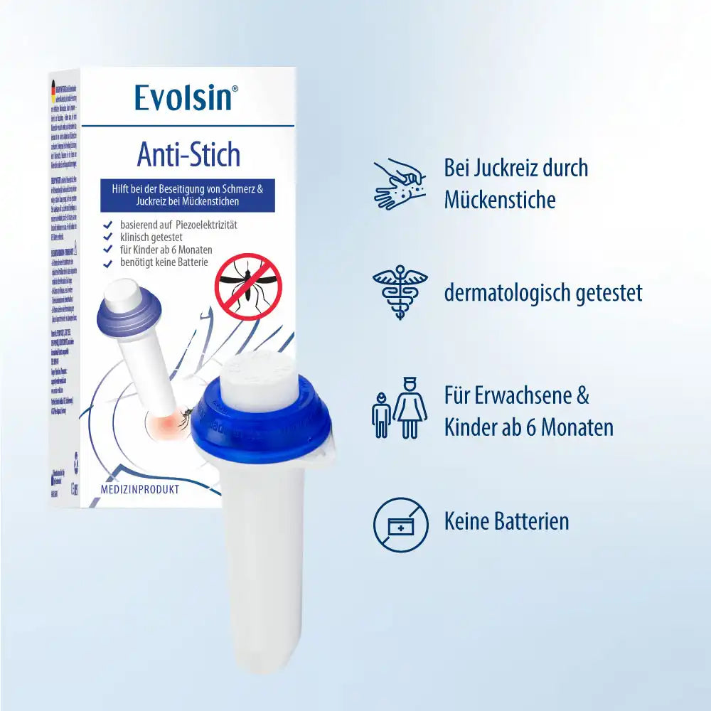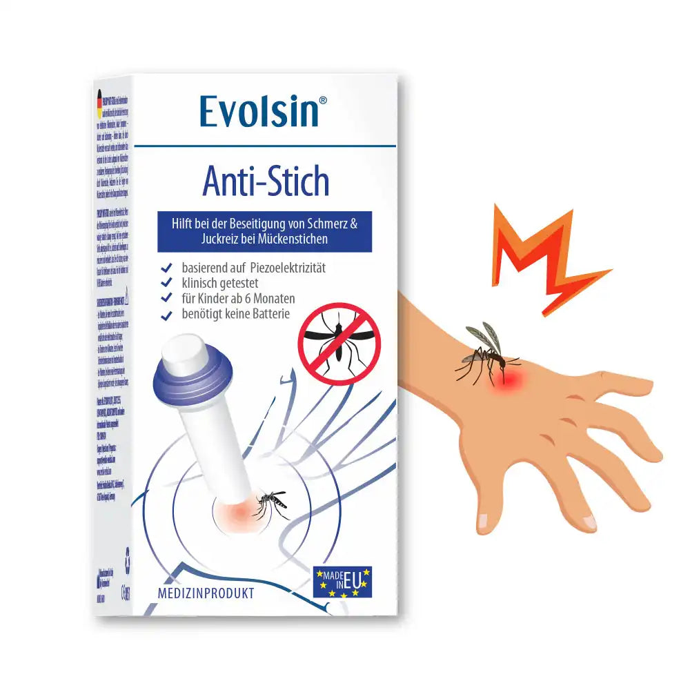 Evolsin® Anti-Stich ist ein Elektrostimulator, der nach dem Mückenstich eingesetzt wird. Durch die Freisetzung von elektrischen Mikroimpulsen können lokale Symptome, wie Juckreiz und Entzündung (Schwellung), gemildert werden.