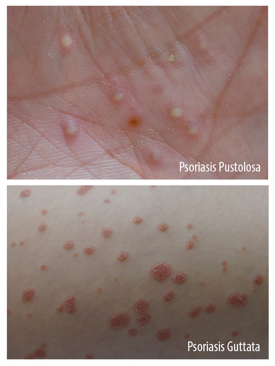GUTTATA: Diese Form von Schuppenflechte zeigt sich als kleine, runde, rote Flecken auf der Haut, die normalerweise auf dem Rumpf, den Armen, Beinen und der Kopfhaut auftreten. Sie tritt häufig nach einer Infektion wie z.B. Streptokokken-Infektion auf und betrifft oft Kinder und junge Erwachsene.
